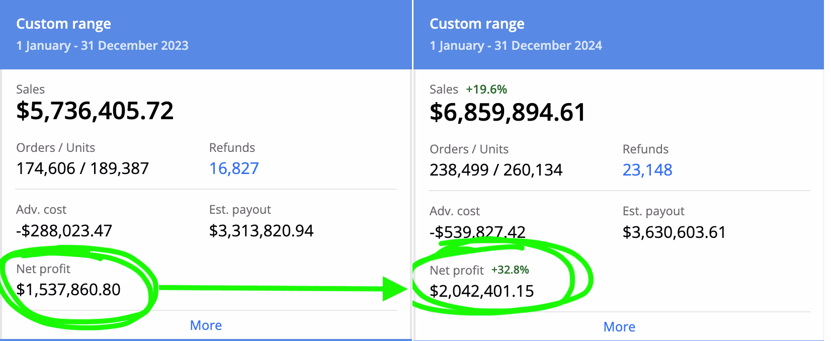Scaled to $6.86M sales (+19.6%) while lifting net profit to $2.04M (+32.8%) using our Profit-First PPC system (cut bleeders, reallocate to winners, protect contribution margin).